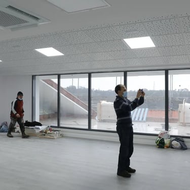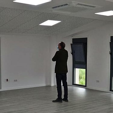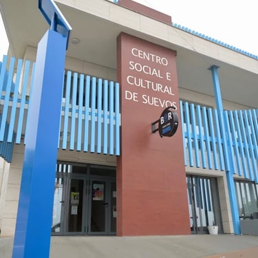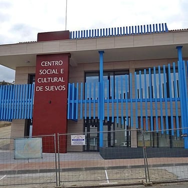El elemento que más llama la atención del nuevo Centro Cívico de Suevos es la envolvente exterior de color azul, que está construida en acero. El entorno del edificio también ha sido urbanizado.
